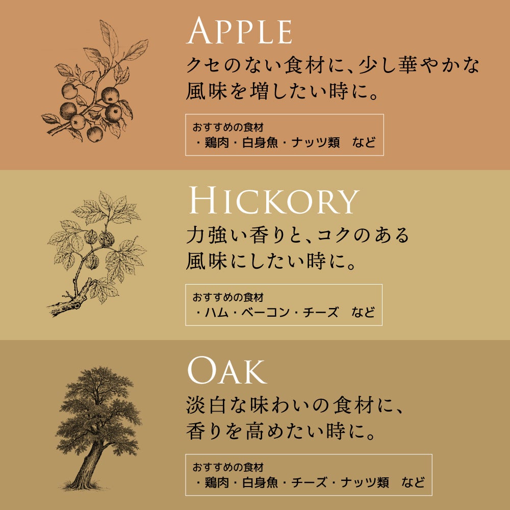 また、6種類のスモークチップが付属。食材や気分に合わせて燻製を楽しめます。
