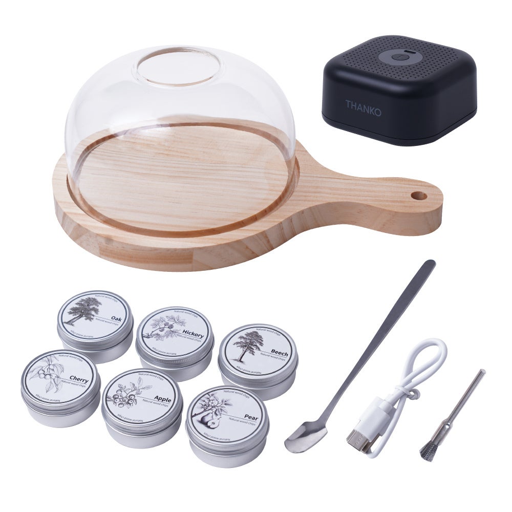 ・セット内容/本体、チップトレイ(本体にセットされています)、スモークポット、USBケーブル、チップ用スプーン、お手入れブラシ、スモークチップ(6種類)Cherry・Pear・Beech・Hickory・Apple・Oak、日本語取扱説明書