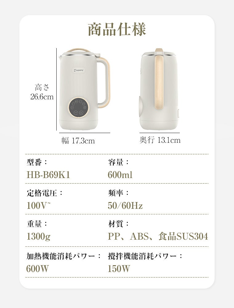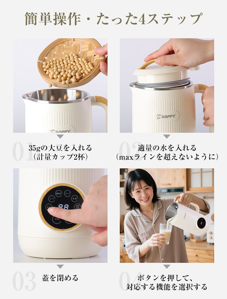 SOPPY豆乳メーカーは、シンプルなワンタッチ操作と高性能ブレード、均一加熱システムを搭載し、誰でも短時間で新鮮な豆乳を作ることができます。