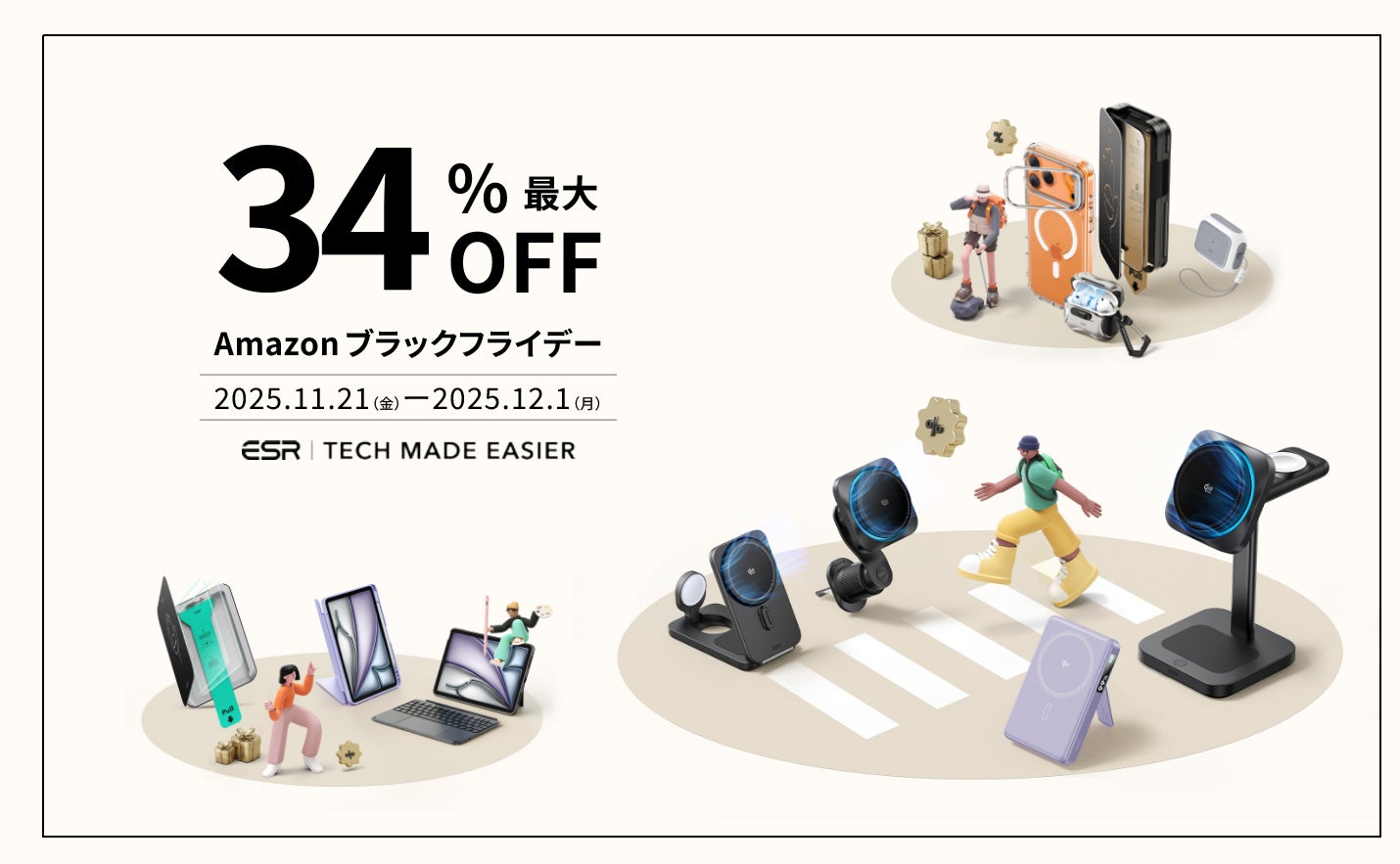 スマートフォンアクセサリーメーカーESR(本社:香港、CEO:ティム・ウー)は、Amazonにて、2025年11月21日(金)から12月1日(月)23時59分まで、ブラック・フライデーキャンペーンを開催いたします。当期間中は、Qi2.2対応マグネット式ワイヤレス充電器、iPhone 17シリーズ用ケース、iPhone及びiPad専用スクリーン保護フィルム、iPad用キーボードケース、保護ケース、イヤホンケースなどが、Amazon公式ショップで最大34%オフでご購入いただけます。