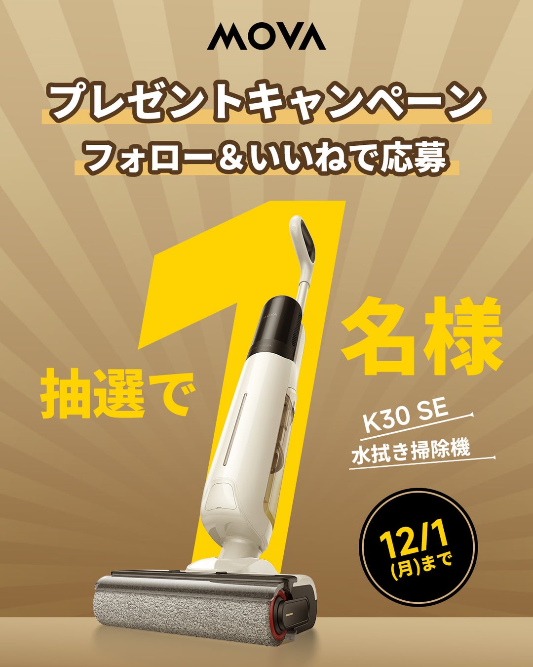 12月1日(月)までの期間に、対象のMOVA公式SNSアカウントをフォローし、キャンペーン投稿へいいねまたはコメントをいただいた方の中から抽選で「MOVA K30 SE」をプレゼントします。各SNSにつき1名様ずつ、計2名様に製品が当たります。