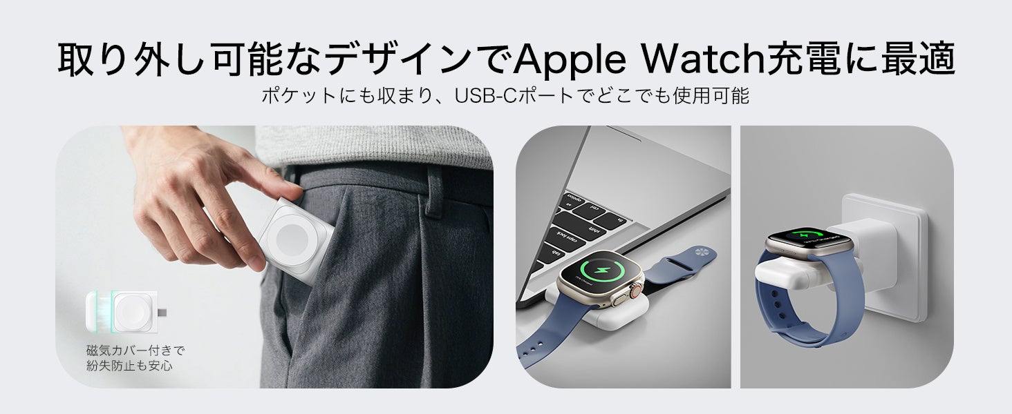 3つデバイスを同時に充電できる「ESR CryoBoost® 3-in-1 マグネット充電ステーション(25W)」は、Apple Watch S10も30分で50%充電可能なAppleのMFW認証を受けた第2世代ウォッチ充電モジュールを搭載し、すべてのiOSアップデートに対応し、長く安心して使用できます。ウォッチ充電器は、USB-C対応の着脱式設計で、取り外して単独での持ち運びでき、USB-Cソケットから電源を取ることで単独での使用も可能です。