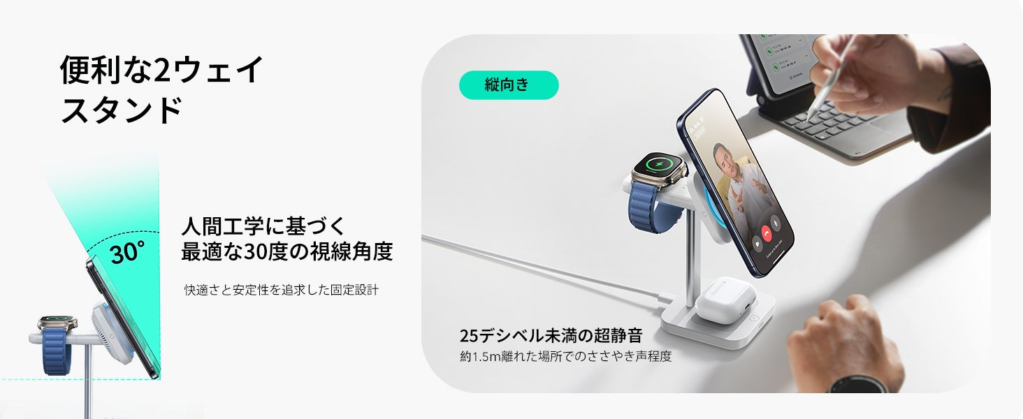 人間工学に基づく、快適な30度の視線角度が作り出す快適なスタンドは、最大1200gの強力な磁力で縦・横問わずiPhoneをしっかりワイヤレス吸着し、ニーズに合わせた快適なスタンド使用が可能です。
