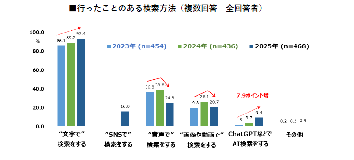 「“文字で”検索をする」、「ChatGPTなどでAI検索をする」人が増加している。特に「ChatGPTなどでAI検索をする」人は2023年比で7.9ポイント増と大きく伸長。一方、音声や画像、動画での検索利用率は、2024年は上昇したものの2025年は低下傾向となっている。