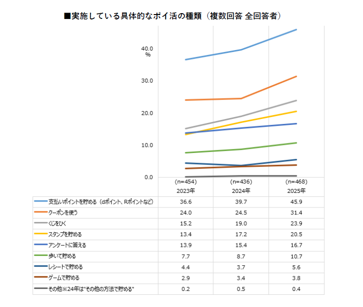 実施している具体的なポイ活として多かったのは、支払いポイントを貯める(dポイント、楽天ポイントなど)が最も多く45.9%。クーポンを使う(31.4%)、くじをひく(23.9%)がそれに続く。