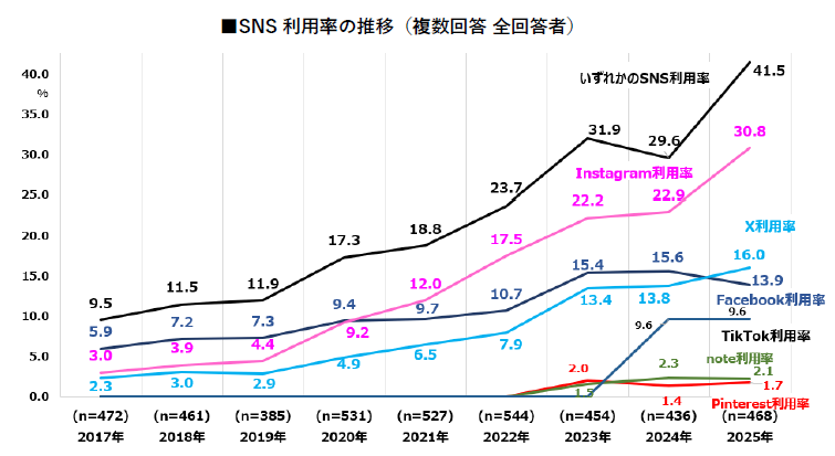 一方、Facebookの利用率は2017年の調査開始以降初めて低下し、2024年比で1.7ポイントダウンの13.9%となった。