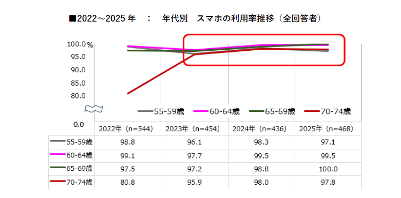 50,60代はもちろん、70代も「スマホ」の利用率が3年連続で95%を超えました。スマホ利用における世代の垣根はなくなり、「シニアはデジタルが不得手」というイメージは過去のものとなりました。