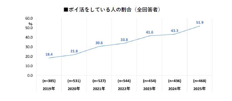 ショッピング・投資などの経済活動においてポイ活をしている人の割合は年々増加しており、2025年は51.9%と半数を超えた。