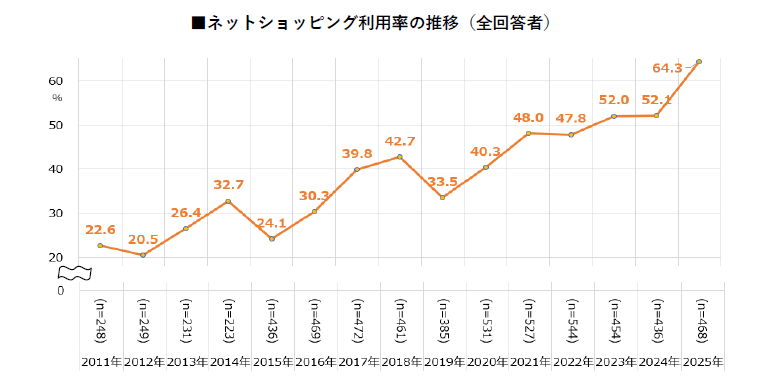 ■ ネットショッピングの利用率は急増、2025年は64.3%が利用経験あり