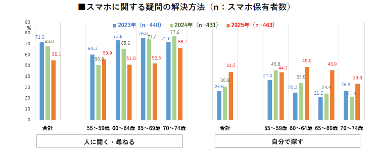 「人に聞く・尋ねる」人は、2023年の71.6%から16.5ポイント低下し55.1%。69歳以下はいずれも50%台に落ち着く一方、70代のみ66.7%と依然高い水準になっている。しかし全体的に「人に頼る」から「自己解決」へのシフトが始まっている。