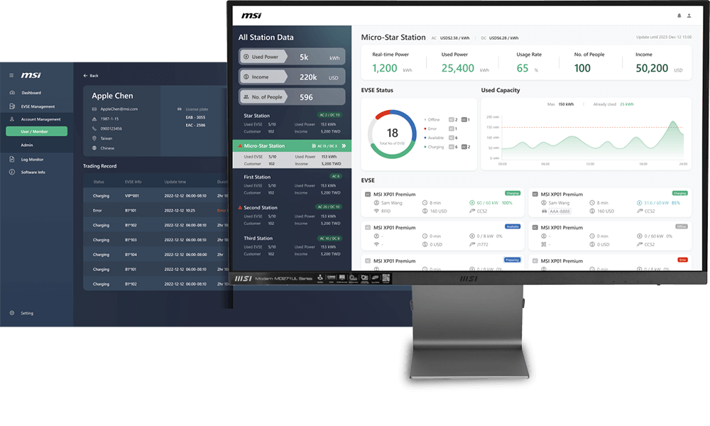 MSI eConnectは、電力効率とステーション管理の最適化を目的とし、オペレーターや住居管理者がクラウドまたはオンプレミス接続を通じて、モニタリングと制御を行えるようにします。動的負荷分散、時間帯別料金、会員管理、ナンバープレート認証、カスタマイズされたAPIサービスによるシステム間統合などをサポートしています。