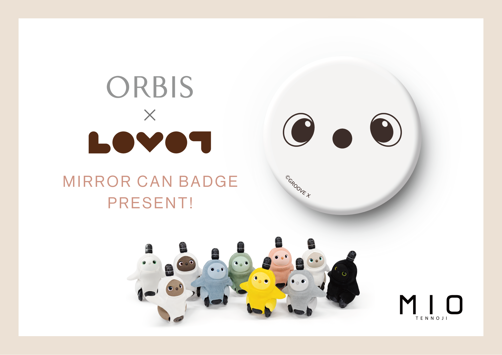 天王寺ミオ 本館3Fのオルビスにて税込み5,500円以上お買い上げのお客様へ、お買い上げレシートを持ってLOVOTストア 天王寺ミオ店へお越しいただくとLOVOTオリジナルミラー缶バッジをプレゼントいたします。