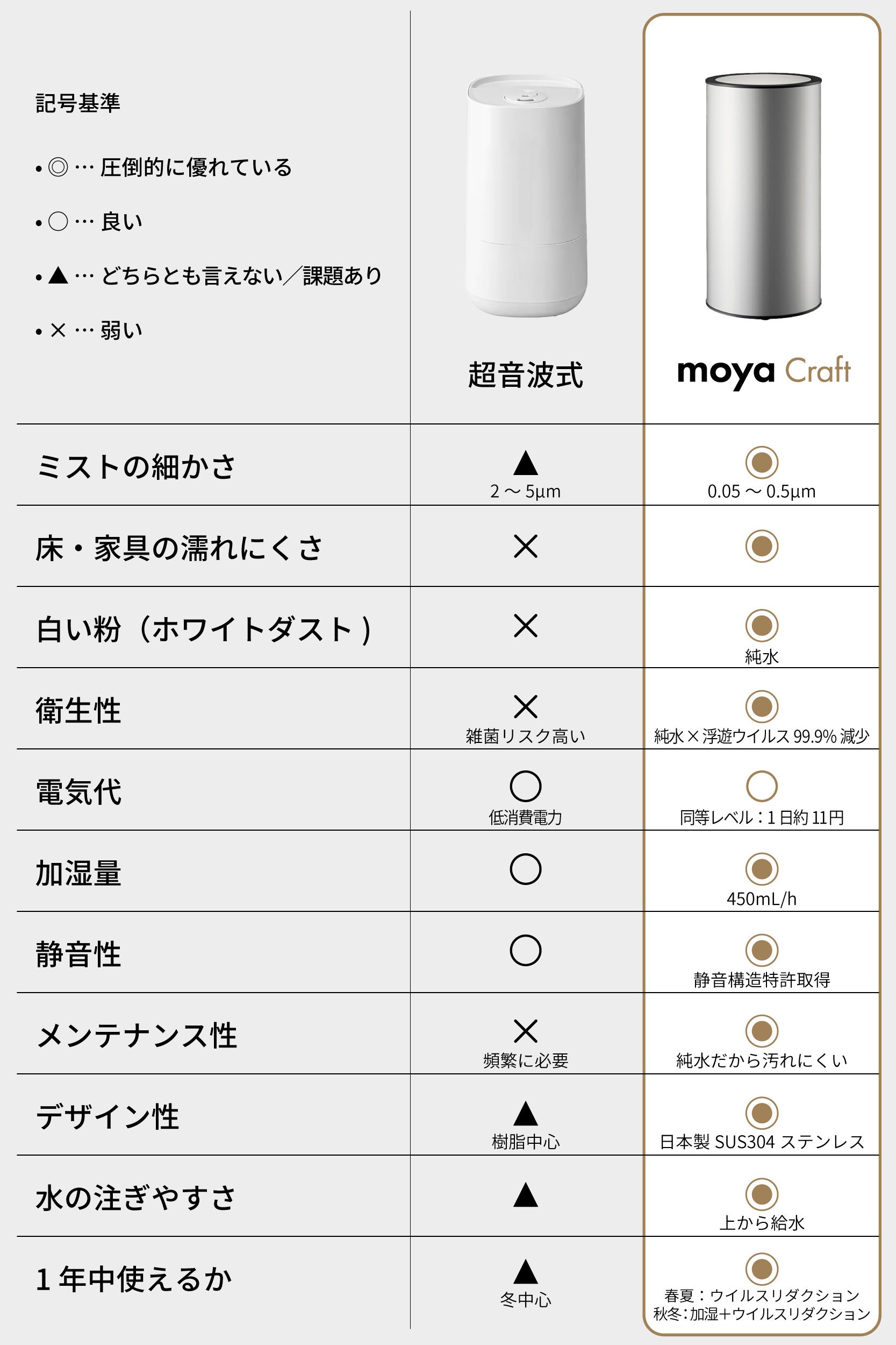 moya Craft は、「純水生成 × ウルトラマイクロミスト」という全く新しいアプローチにより、この両方の課題を根本から解決。