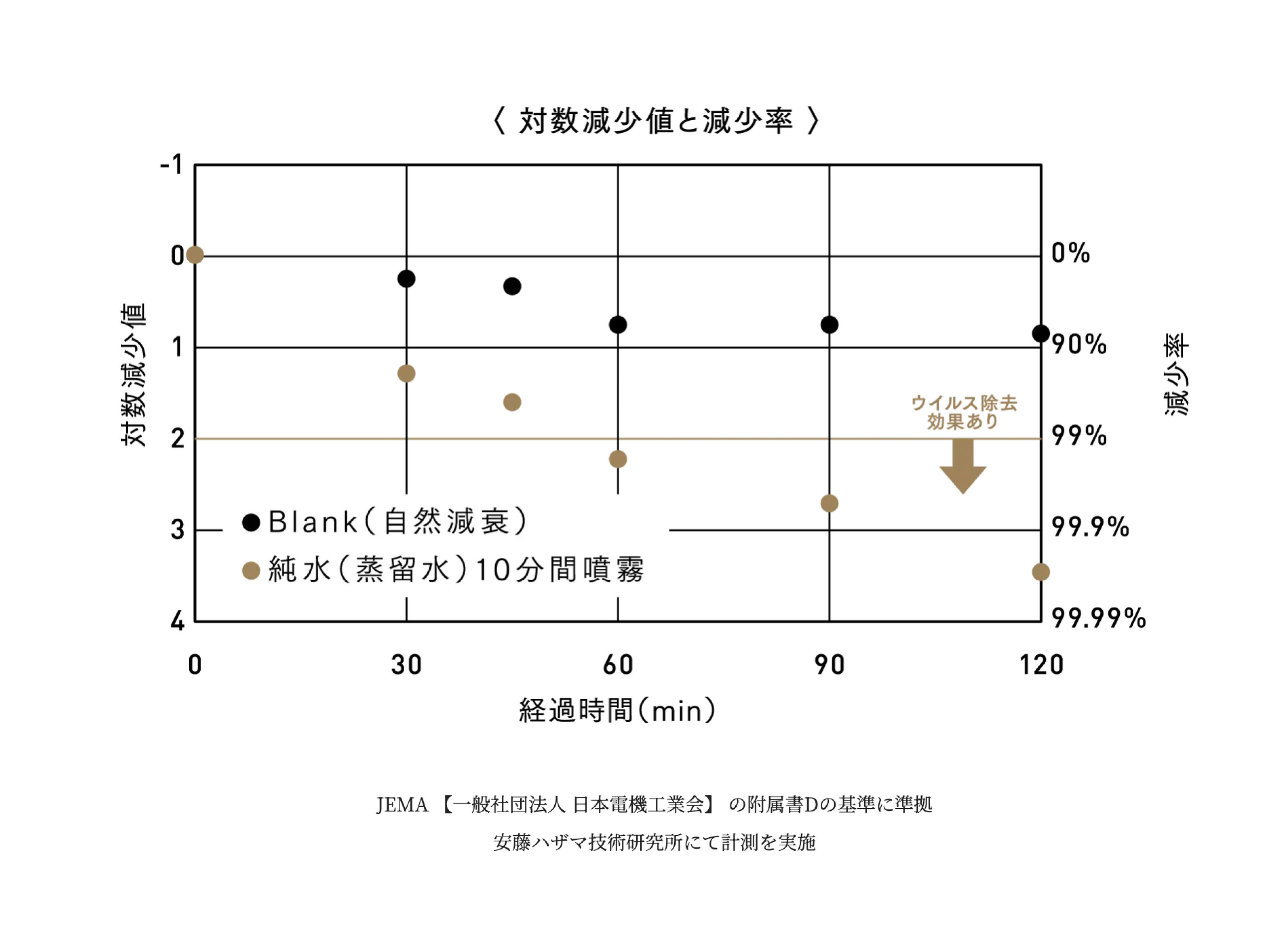 さらに純水ウルトラマイクロミストによって、空間浮遊ウイルスが99.9%減少する*¹ことを安藤ハザマ技術研究所との共同研究開発により確認されています。