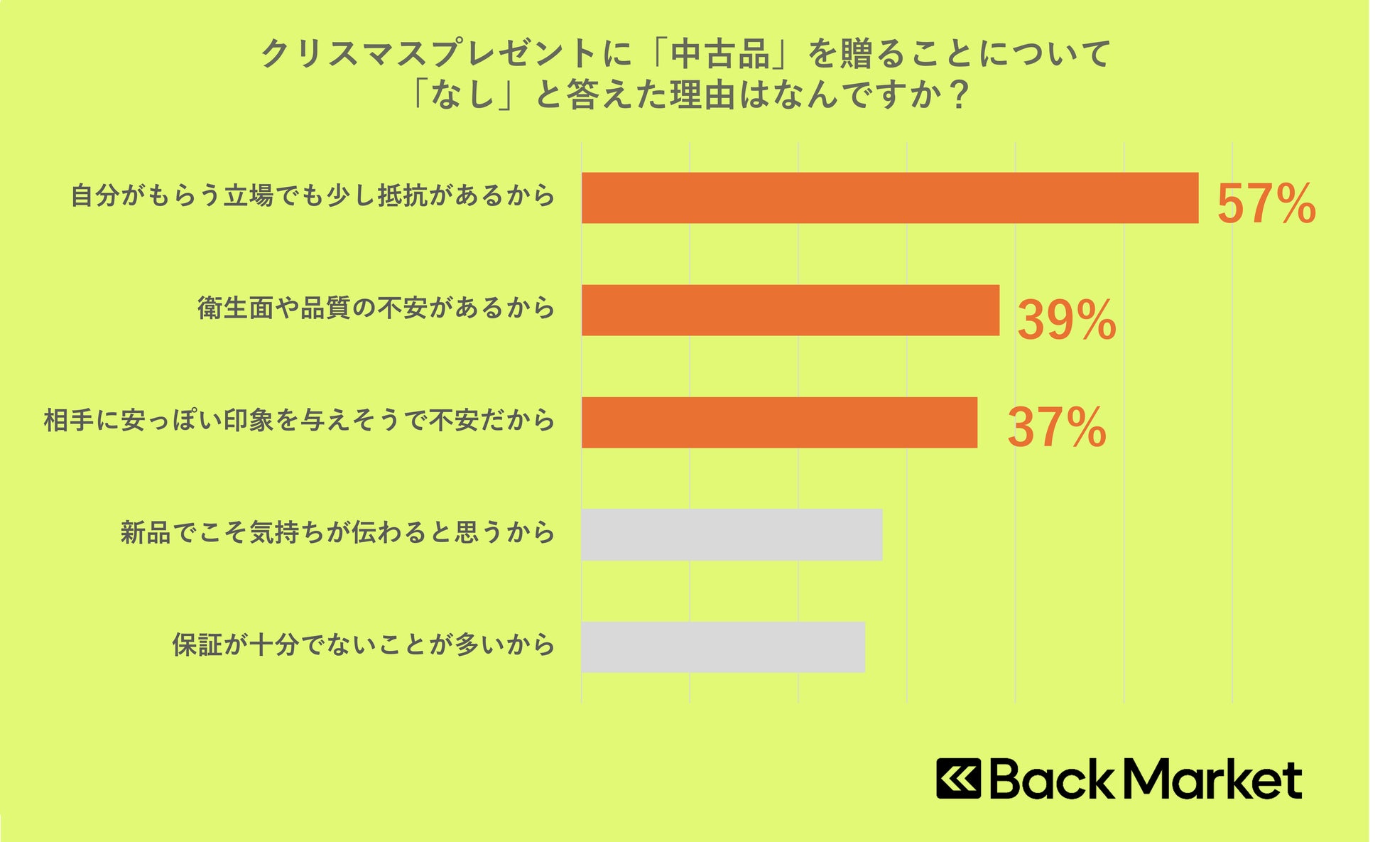 電子機器やデジタルツールを贈る際に中古品を選ぶことについて尋ねたところ、約64%が「なし」と回答しました。理由としては、「自分がもらう立場でも抵抗がある」(約57%)、「衛生面や品質への不安」(約39%)、「新品でこそ気持ちが伝わる」(約28%)など、新品に対する安心感や相手への気遣いが背景にあることが分かりました。