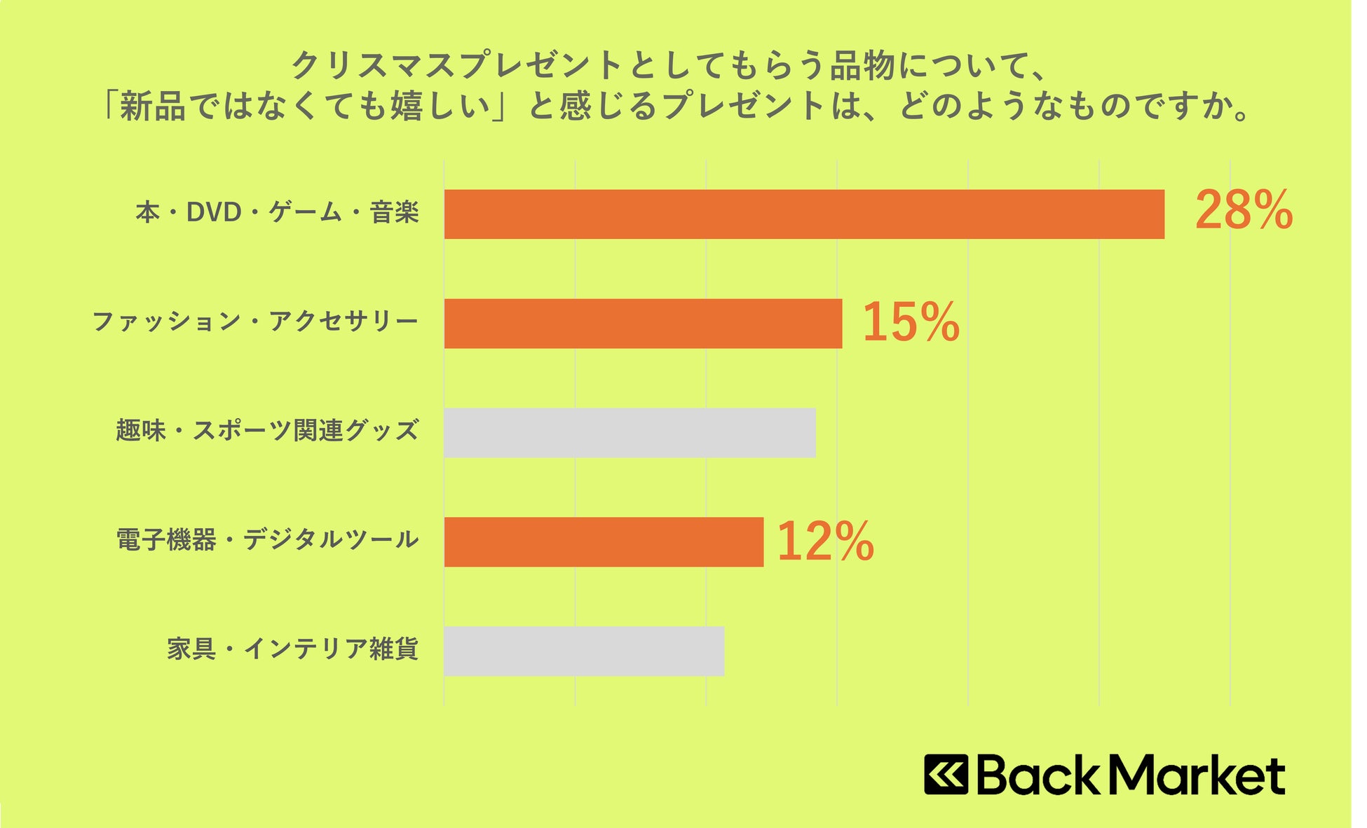 新品でなくても嬉しいクリスマスプレゼントを聞いたところ、「本・DVD・ゲーム・音楽」関連が約28%で最多、次いで「ファッション・アクセサリー」関連が約15%、「電子機器・デジタルツール」関連は12%という結果となりました。用途や思い入れによっては、中古品やリファービッシュ品でも喜ばれる傾向がうかがえます。プレゼントとしてリファービッシュ品を選ぶことへのハードルが、今後下がる可能性も考えられます。