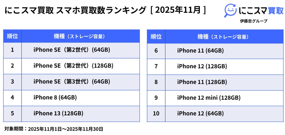 買取数ランキングでは、提携しているAmazon.co.jpで開催された「Amazon ブラックフライデー 2025(2025年11月24日〜12月1日)」の影響もあり、「にこスマ買取」全体で取引数が40%ほど増加する中、前月から引き続き、iPhone SE(第2世代)の64GBモデルと128GBモデルが、それぞれ1位と2位にランクインしました。