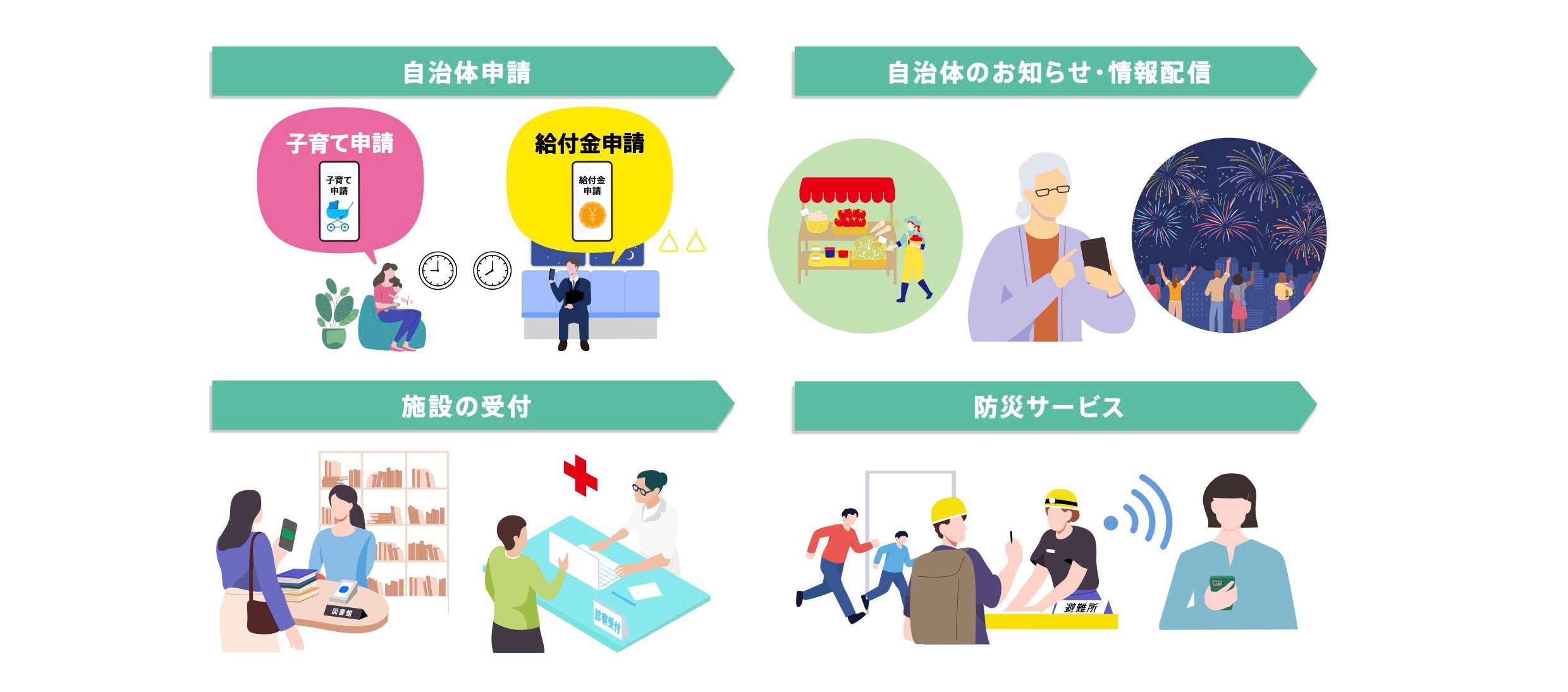 生活サービス機能により、皆さまの地域生活の”不”便や”負”担を解決します。例えば子育て申請において、従来は平日に会社を休み申請書を提出するために自治体窓口に行かなければならないところ、本機能でオンライン申請が可能となるため、時間と場所の制約が無くなります。さらに、給付金申請のほか、自治体からのお知らせや公共施設・医療機関の受付、避難所での入退管理による効率的な救援物資の配布や安否確認等の防災サービスまで、地域生活に不可欠な情報連携・利用サービスを一体で提供することを目指します。