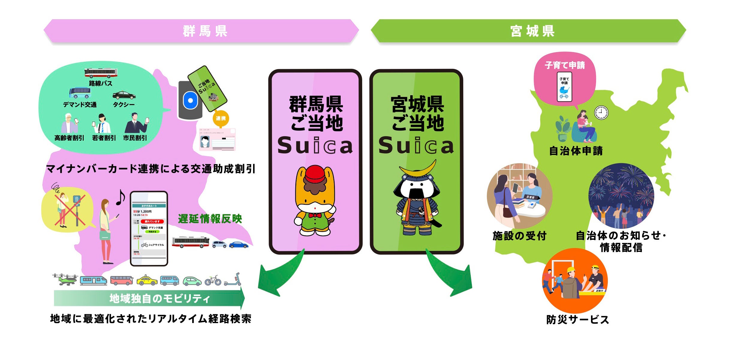 2027年春に群馬県内と宮城県内で「ご当地Suica」を先行スタートします。JR東日本グループのSuica、群馬県で育まれたMaaS(GunMaaS)、宮城県で実装されている生活サービスを組み合わせることで「ご当地Suica」を実現し、両県における新しい当たり前を創ります。