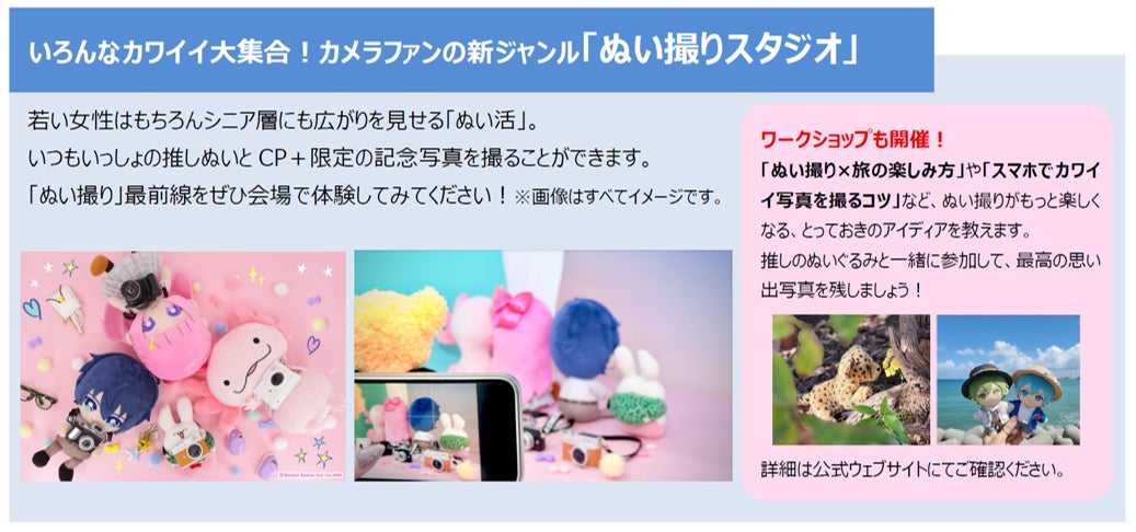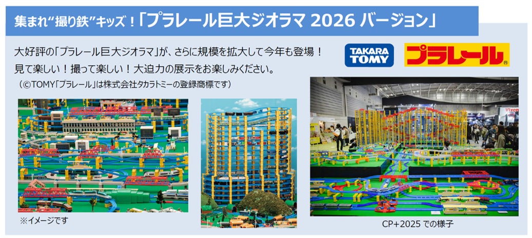 CP+2026のテーマは「Make your world pop. もっと、盛れる。毎日も、特別な日も。」。今回も各社の新製品展示をはじめ、トークイベント、写真展、ワークショップ、ZINE販売会など、充実の企画が満載です。また、大好評のプラレール巨大ジオラマはさらにパワーアップし、若者の間で流行中の「ぬい活」コーナーとして「ぬい撮りスタジオ」も登場。プロや熱心なファンから初心者まで、若者、女性、ファミリー層など、幅広い方々にご満足いただけるイベントになっています。また、新たに、一般入場者とは異なる専用レーンから優先的に入場でき、初日午前中のプレスタイムにも入場できる有料チケットとして「クイックパス」を枚数限定で販売(12月22日 販売開始)するほか、入場の際、スマ-トフォンでQRコードを見せることで入場できる(従来通り紙印刷での入場も可)など、来場者の利便性向上も図っています。是非、活気あふれる“カメラと写真映像の祭典”にご来場ください。