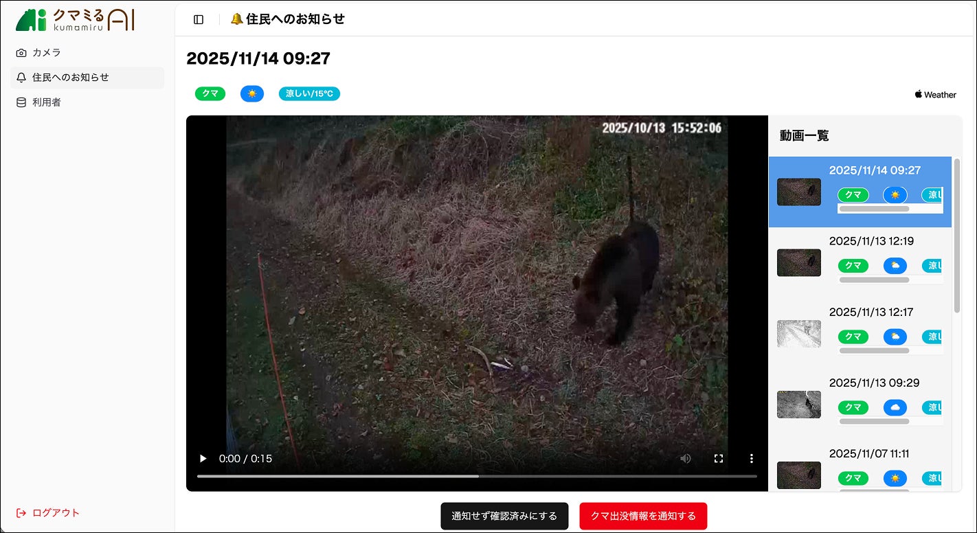 『クマミるAI』カメラで検知後、Webダッシュボードからクマ出没情報を確認