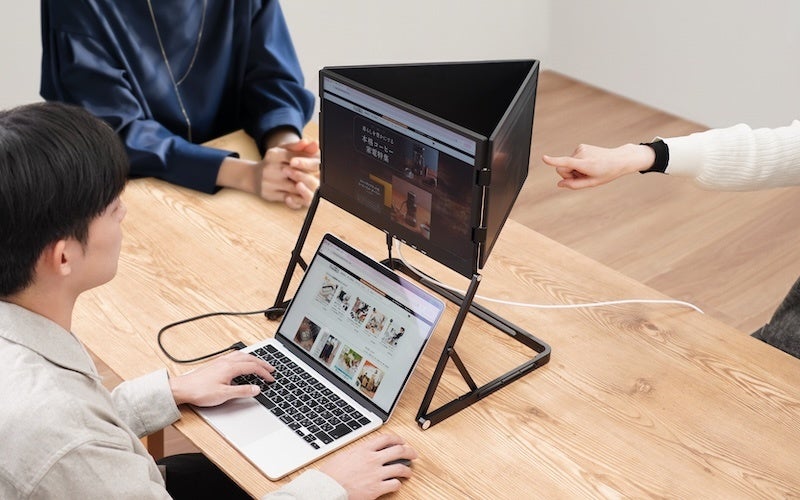 作業効率を上げる「マルチディスプレイモード」や、画面を三角形に閉じて商談に使える「ミラーモード」など用途も多彩。