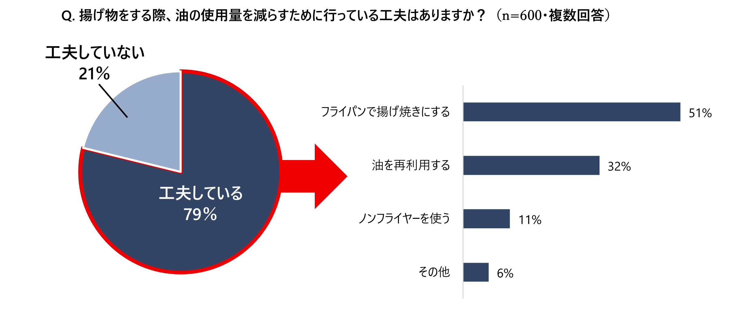 「油の量を減らす工夫」をしている人は79%、工夫の内容は「フライパンでの揚げ焼き」