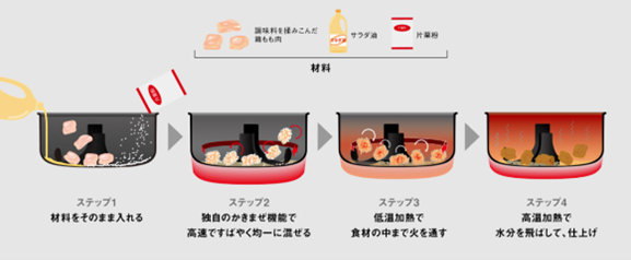 パナソニックのオートクッカー ビストロは、9月に「ビストロジューシーから揚げ」のレシピを公開しました。調味料をもみこんだ鶏もも肉、少量の油、片栗粉を入れてスタートするだけで、簡単にから揚げを作ることができます。鶏肉に粉をまぶす必要もなく、蓋をして調理するので油跳ねの心配もありません。少量の油で調理できるので、調理後の油の処理も不要です。