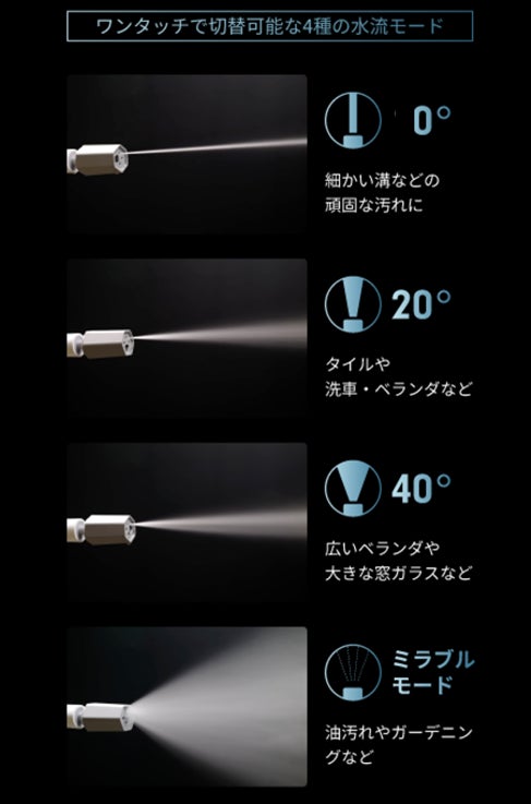 最大3.5MPaのパワフルな高圧洗浄から、繊細な「ミラブルモード」まで、用途に合わせて4段階の調整が可能。これ一台で、外壁の頑固な汚れから網戸や洗車といったデリケートな掃除まで対応します。