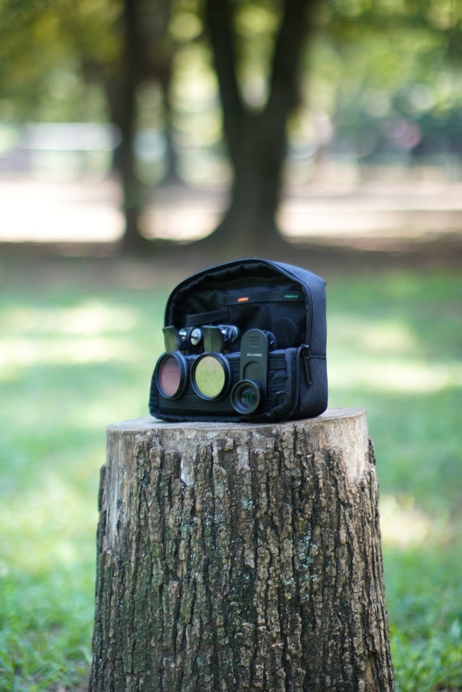 EXAPROシリーズのクリップレンズやフィルタークリップ、マグネティックモバイルスタンドなどを同時に収納可能。クリップレンズは、ポーチ内部のゴムバンドに引っ掛けることで、移動時も安定して収納できます。