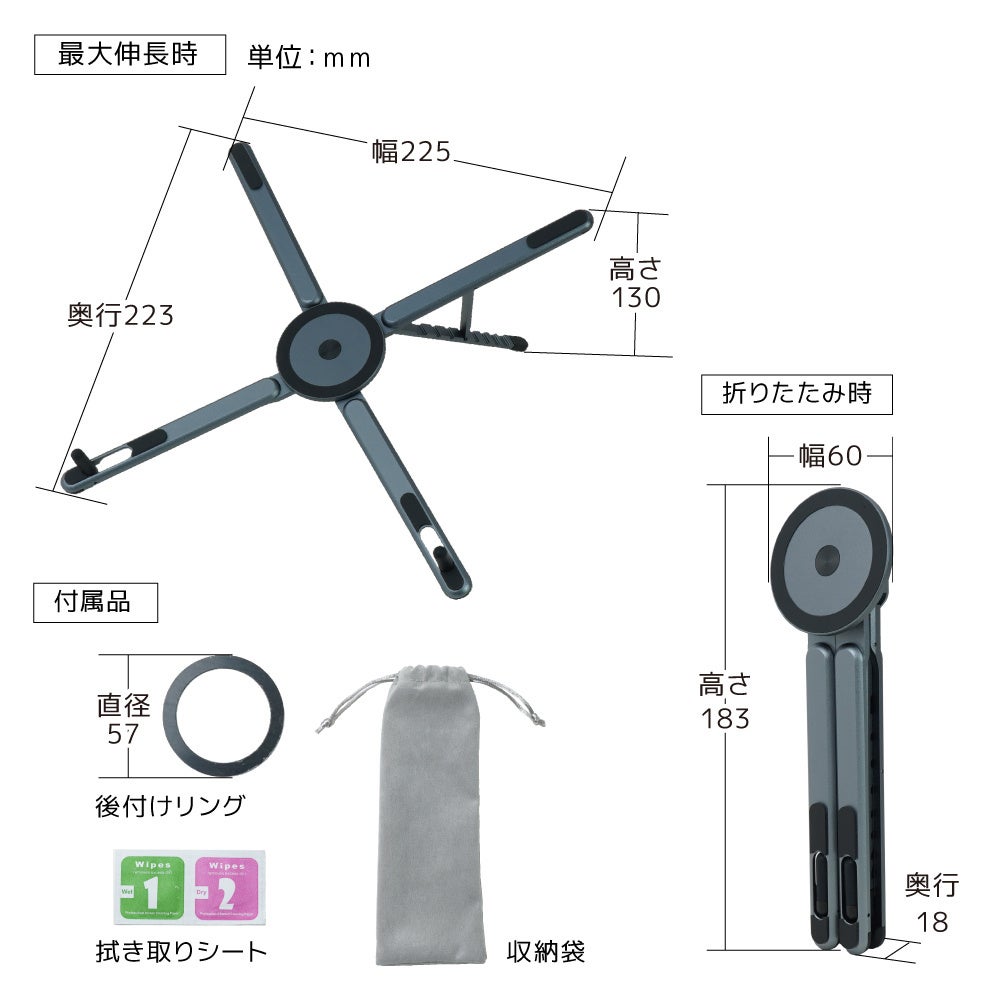 本製品は、わずか約150gの軽量コンパクト設計ながら、変形させることで4通りの使い方ができる多機能スタンドです。
