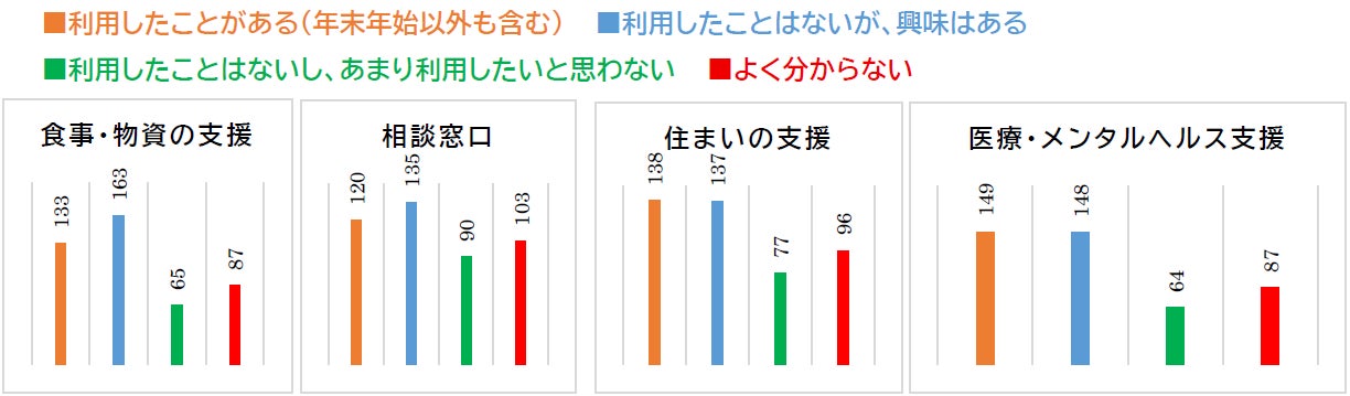 炊き出し・フードパントリー、相談窓口、住まい支援、医療支援など、年末年始にも利用可能な支援について尋ねたところ、「全く知らない」が4〜5割にのぼり、支援の存在が広く届いていない実態が明らかになりました。一方で「内容をよく知っている」は1割前後にとどまり、支援情報へのアクセス格差が大きいことが分かります。必要な支援があっても認知に至らず、利用につながらない傾向が強く示されました。