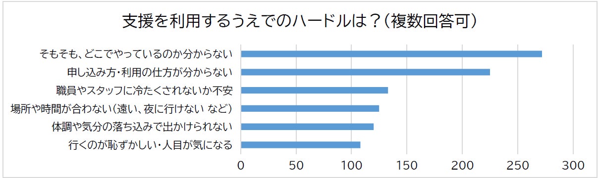 支援を利用する際のハードルとして、最も多く挙げられたのは「どこでやっているのか分からない」(61%)でした。また「申し込み方・利用の仕方が分からない」(50%)、「場所や時間が合わない」、「行くのが恥ずかしい」など、情報取得の困難さと心理的負担の双方が壁となっています。体調不良や人間関係の不安など個人要因も見られ、支援が“存在しても届かない”構造的な課題が浮かび上がりました。