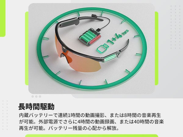 (今後販売予定)を追加することで、連続録画時間は5時間に延長され、オーディオ再生は最大48時間可能になります。長距離のライドや数日間にわたる探検でも、バッテリー切れの心配はありません。