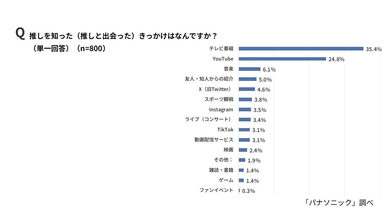 《推しを知ったきっかけで最も多いのは「テレビ番組」が35.4%となり、次いで「YouTube」が24.8%という結果に。10代は「YouTube」が36.3%と最も多く、30代以上はテレビが多数となり、年代によって“推しとの出会い方”に違いも。》