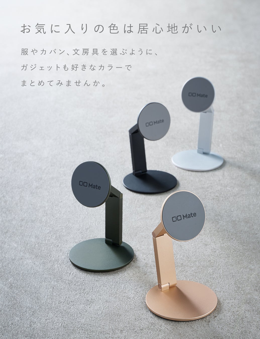 デスクはもちろん、リビングや寝室などのインテリアに合わせてご使用いただける、CIO Mateカラー(4色)で展開。