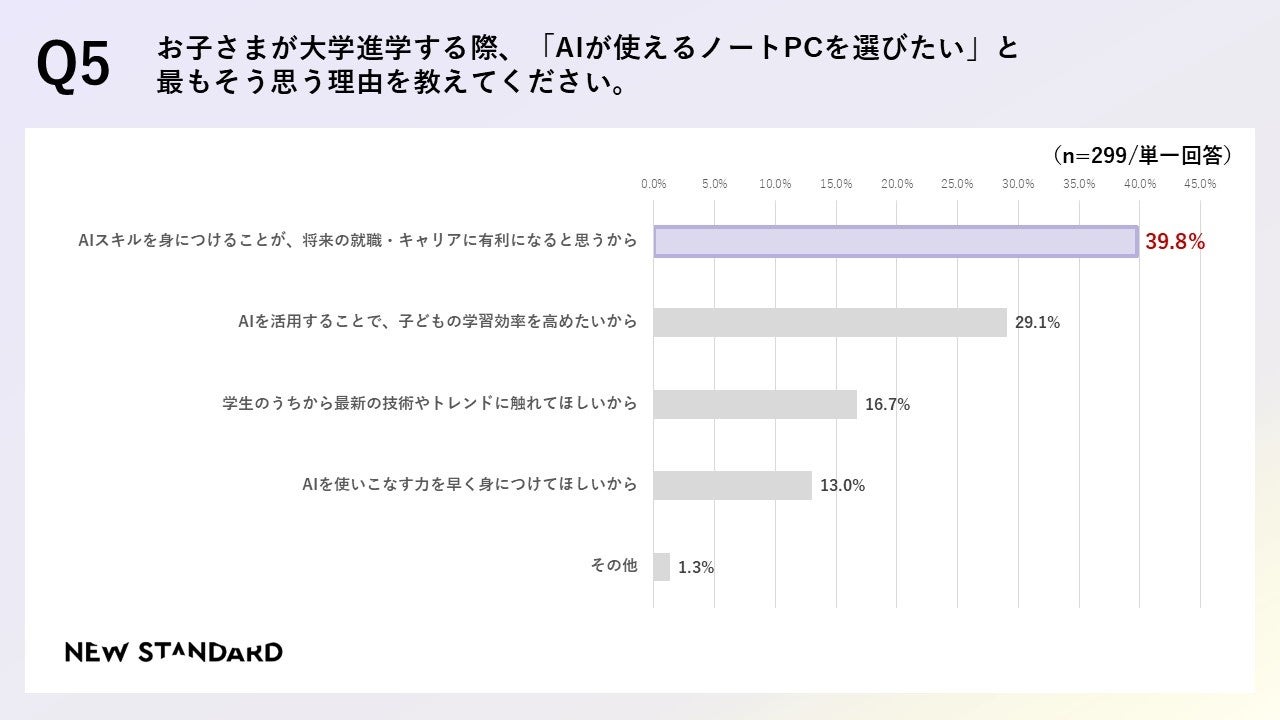 いまや大学ではレポート作成・情報収集・語学学習など、あらゆる場面でAI活用が前提になりつつあり、保護者は「入学直後からAIを使える環境を整えることが学習の土台になる」と感じているようです。PC選びも「価格」「軽さ」より前に、“AIが使えるかどうか”から比較する時代に移行していることが伺えます。