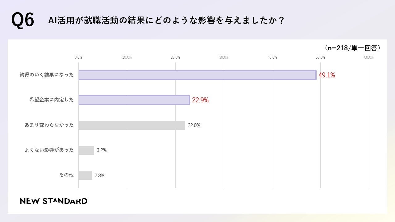 実際に就職活動の場でAIを活用した学生の 49.1%が「納得のいく結果になった」 と回答し、22.9%は希望企業への内定獲得に結びついている傾向が見て取れた。