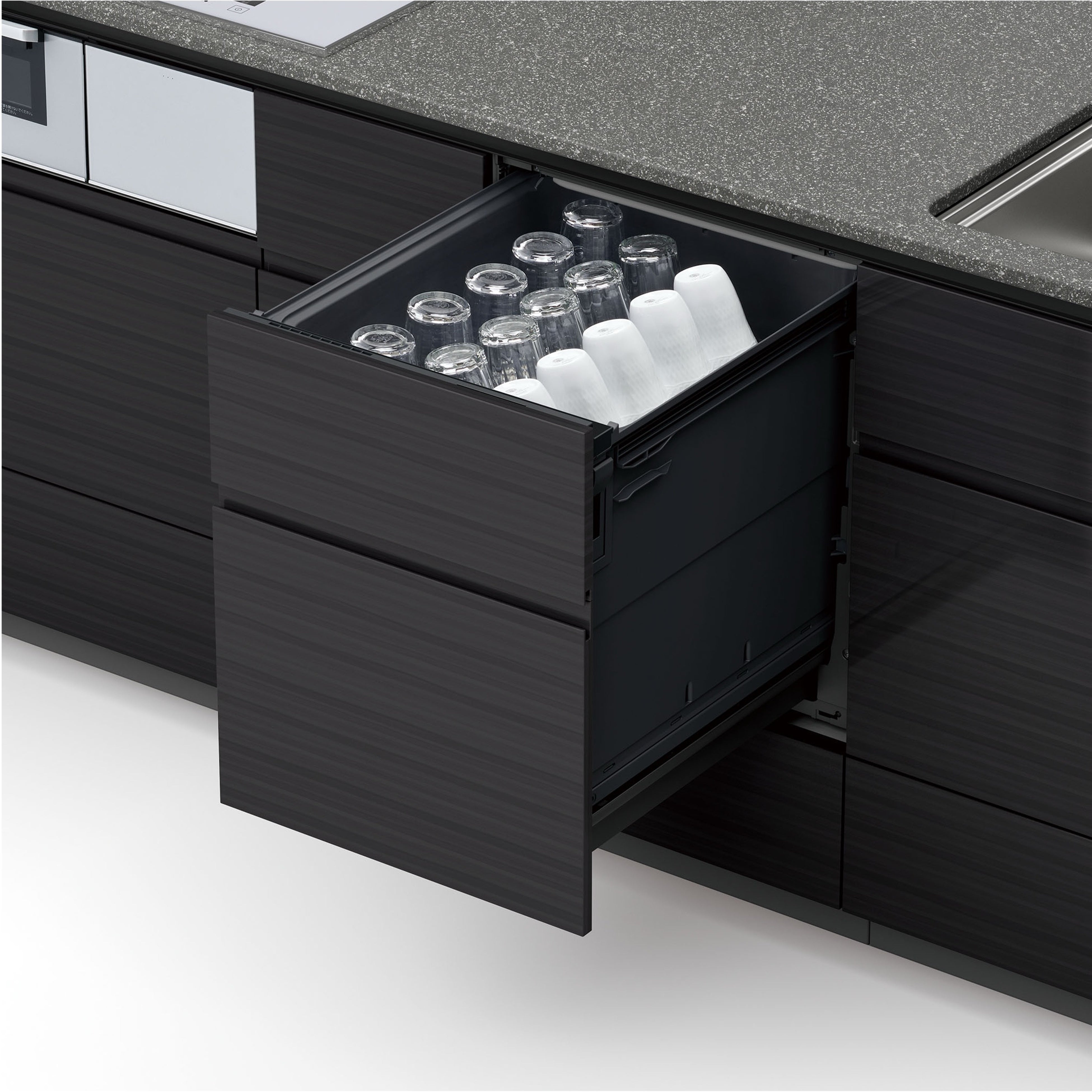 タンク式の食洗機は、分岐水栓の取り付け工事が難しい水栓の方や、賃貸住宅にお住まいの方におすすめです。さらに、ドアが上に持ち上がるように開く「リフトアップオープンドア」により、シンク横などの狭い場所にもスマートに設置することが可能。