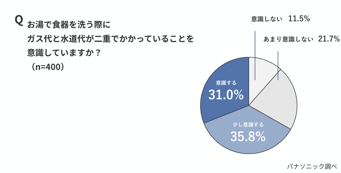 食器洗いの際にお湯を使うことで実は「水道代」とお湯を温めるための「ガス代」「電気代」 が同時にかかっていることを意識している人はまだ少ないというのが現状です。今回の調査でも、手洗いでお湯を使っている方の多くは水道代に目が行きがちで、お湯を温めるためのガス代や電気代もかかる点については、意外と見過ごされていることが明らかになりました。