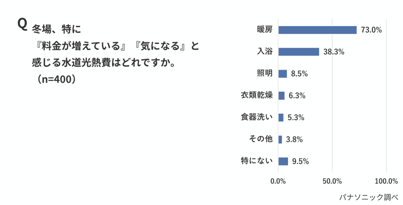 冬場、『料金が増えている』『気になる』と感じる水道光熱費の項目を聞いたところ、「暖房」が73.0%と1位でした。次いで「入浴」が38.3%で2位が続きますが、毎日行う家事である「食器洗い」と回答した人はわずか5.3%にとどまりました。