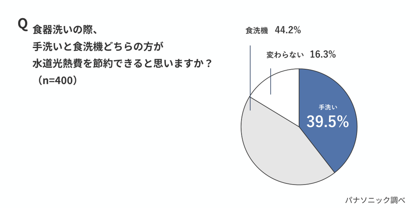 今回の調査で最も注目すべきなのが、「手洗いと食洗機、どちらが水道光熱費を節約できるか?」という設問では、 約4割の方が、「手洗いの方が安い」と回答しました。依然として「機械を使うことは電気代がかかるため高い」というイメージを持つ層が一定数存在することがわかります。