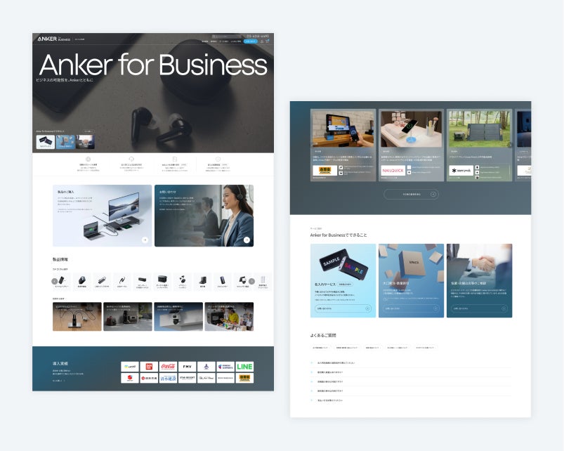 アンカー・ジャパンでは、多様なワークスタイルの普及に伴い、個人のお客様のワークシーンや充電環境の充実化のみならず、法人のお客様に向けても2023年4月に見積もりを自動で算出できる法人向け公式オンラインストア「Anker for Business」をオープンし、各社の抱える業務環境の課題解決や充実化をサポートして参りました。今回、多岐に渡るAnkerグループ製品の導入をよりスムーズにご検討いただくため、そしてご購入までのフローがわかりやすくご確認いただけるよう、新たに設計し直しました。また、ご購入前の検討段階でもお気軽にお問い合わせいただける法人のお客様専用の電話窓口開設に加え、より手軽に会話できるAIチャットでのお問い合わせ対応も開始し、ご検討段階から各社に合わせた柔軟なご提案ができるよう、サイトのローンチ以来初のリニューアルをいたしました。また新たに製品関連資料をダウンロードいただける他、法人各社様の事例を掲載や、様々なビジネスシーンの切り口で製品ご提案いたします。
