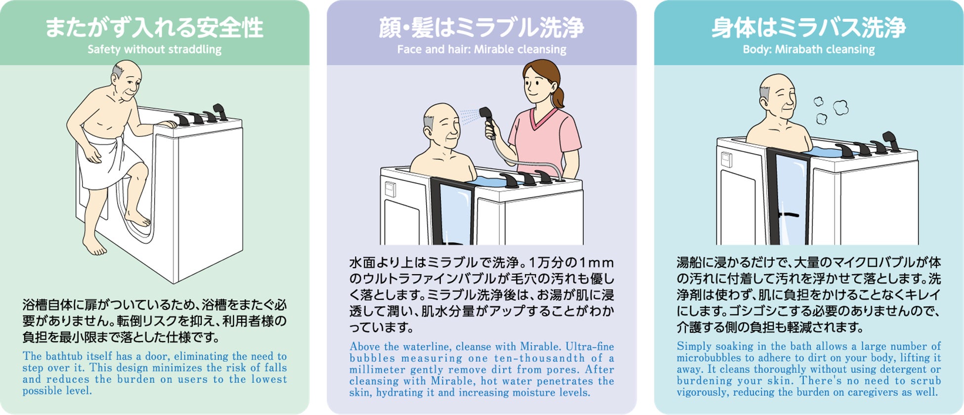 「ミライ人間洗濯機 社会実装版(高齢者施設用)」は、洗剤を使わず、ファインバブルで身体をこすらないやさしい洗浴と肌ケアを両立した、新しい入浴のスタンダードをご提案いたします。ミラバス機能によるマイクロバブル洗浄で、お湯につかっているだけで洗える仕組みや、ミラブルを肌にあてるだけで洗い流せる洗浄体験、さらに洗浄と同時に肌の水分量向上が期待できる点など、介助者・利用者双方にとってのメリットをご体感いただけます。バスタブに溜めたお湯の中でマイクロバブルは、汚れに付着し、剥離させて水面に持ち上げる働きがあるも優れた洗浄効果が期待できます。