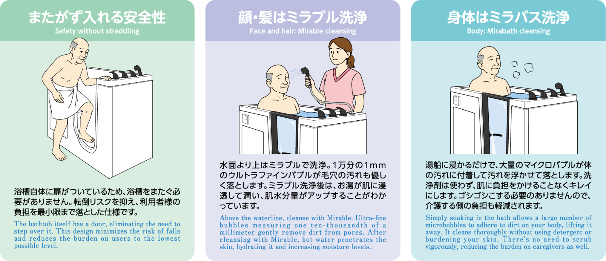 「ミライ人間洗濯機 社会実装版(高齢者施設用)」は、洗剤を使わず、ファインバブルで身体をこすらないやさしい洗浴と肌ケアを両立した、新しい入浴のスタンダードをご提案いたします。ミラバス機能によるマイクロバブル洗浄で、お湯につかっているだけで洗える仕組みや、ミラブルを肌にあてるだけで洗い流せる洗浄体験、さらに洗浄と同時に肌の水分量向上が期待できる点など、介助者・利用者双方にとってのメリットをご体感いただけます。バスタブに溜めたお湯の中でマイクロバブルは、汚れに付着し、剥離させて水面に持ち上げる働きがあるも優れた洗浄効果が期待できます。