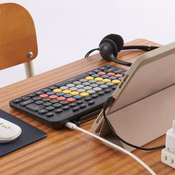 押し間違いによる混乱を避けるため、使用頻度の低い機能を取り除き、よりスムーズにキーボード操作を学習できるよう配慮。プログラミングやタブレット学習に特化した機能を盛り込んだ、独自の日本語配列(JIS)を採用しています。