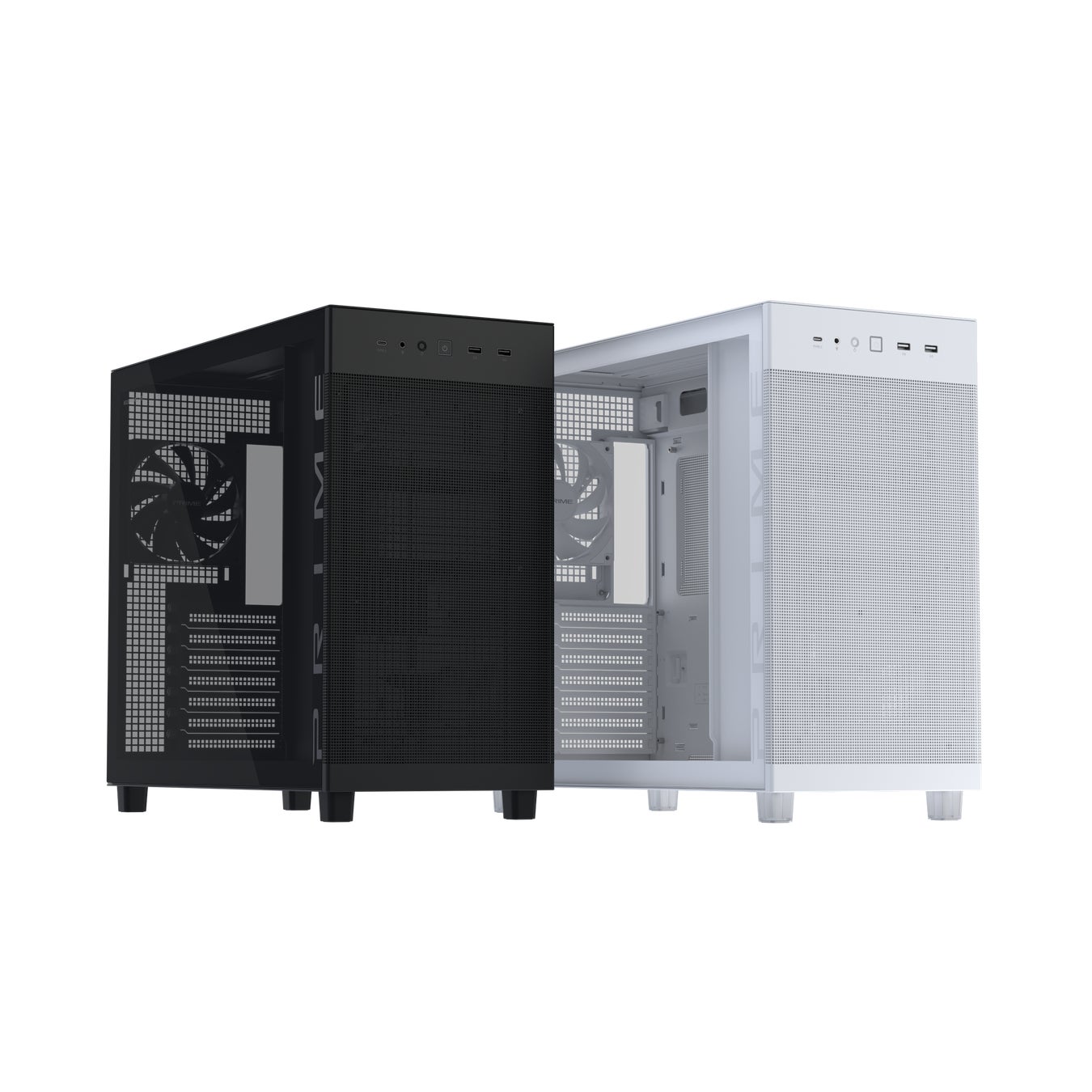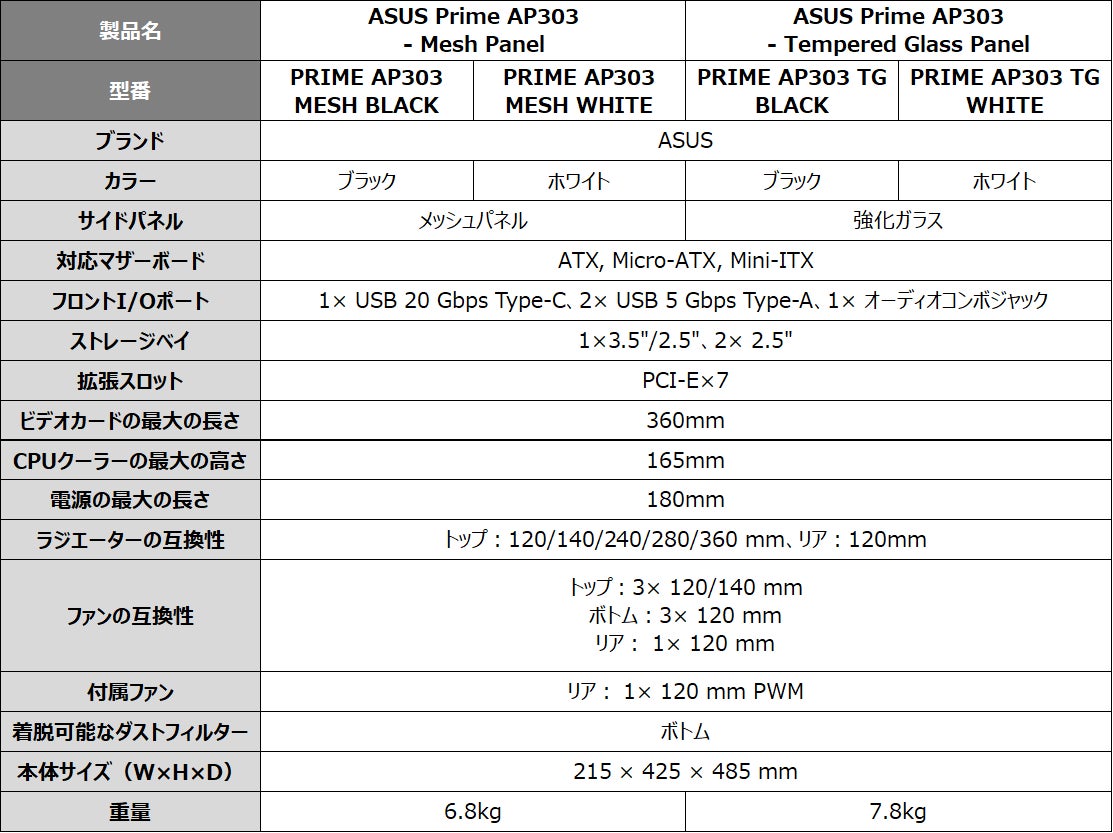 ASUS JAPAN株式会社は、MicroATX対応でコンパクトの人気モデルPrime AP201をベースに、ATXマザーボードに対応させ、360mmのビデオカードや厚さ60mmの360mmラジエーターに対応し、容積44リットルとコンパクトなサイズのATXケース「Prime AP303」シリーズを発表しました。サイドパネルがメッシュパネルのモデルと強化ガラスのモデル、カラーはブラックとホワイトの合計4モデルです。2025年12月19日(金)より販売開始します。
