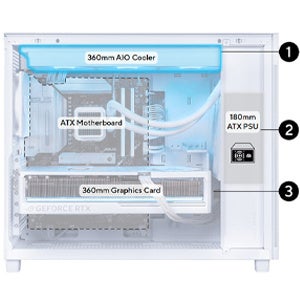 44リットルの筐体に、最大360mmのビデオカード、最大厚60mm・最大360mmのラジエーター、最大180mmのATX電源ユニットに対応。
