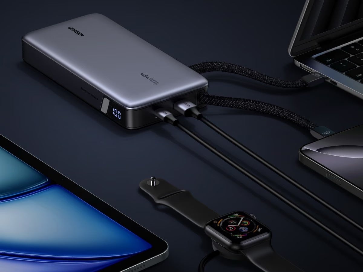 UGREEN 25000mAhケーブル内蔵モバイルバッテリーは、合計165Wで急速充電ができ、2本のUSB-Cケーブルを内蔵したキャリングストラップデザインとなっています。ノートパソコン、タブレット、iPhoneなど、4台のデバイスを同時に充電できます。