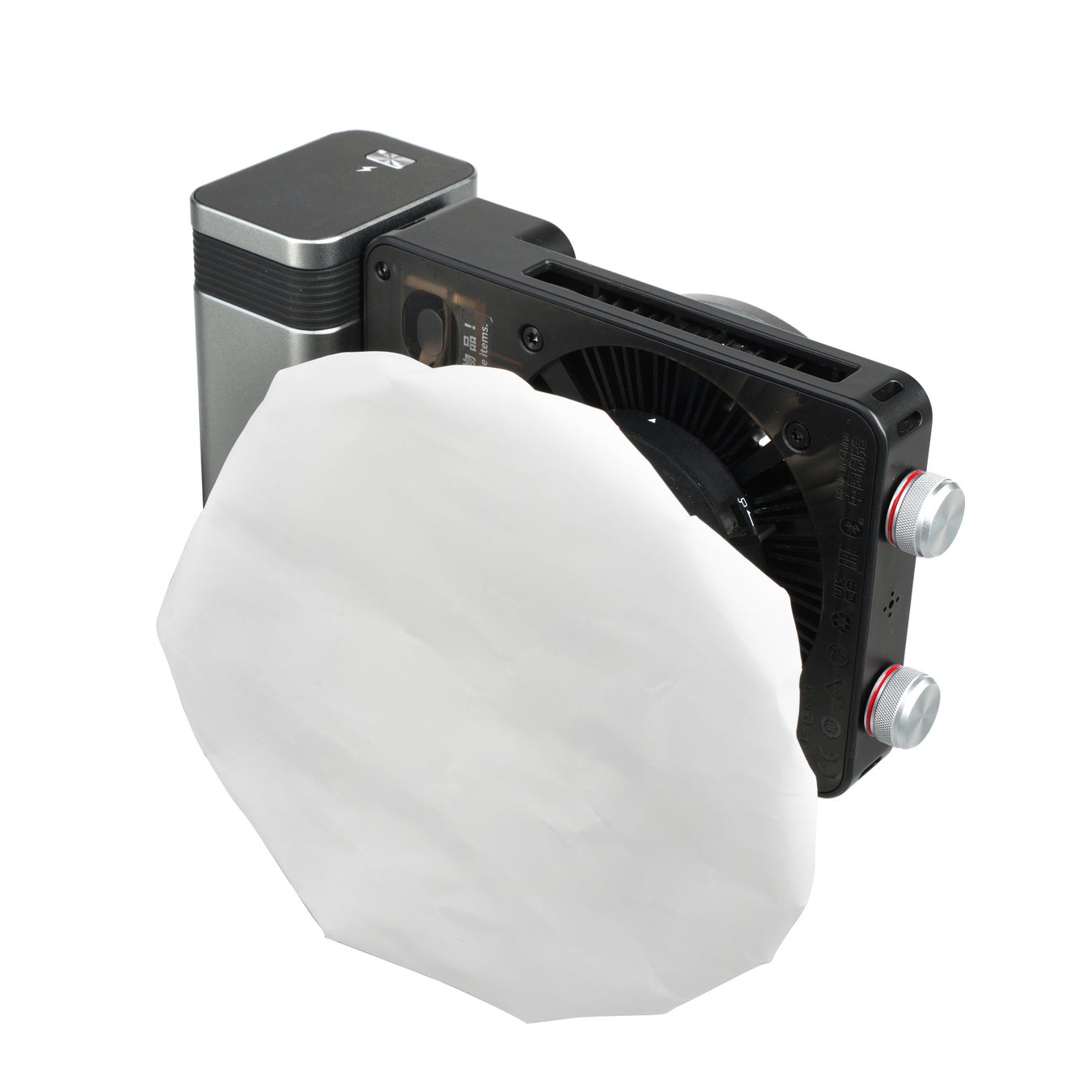 生地はポリエステルの白布製。機材への取り付けはディフューザー開口部のゴムを広げてストロボ発光部、リフレクター前面に被せるだけ。簡単にご使用いただけます。